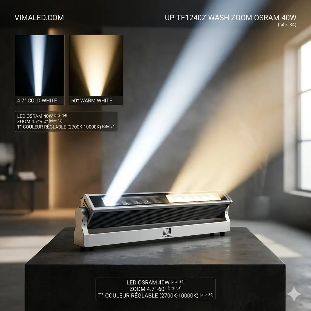 Le UP-TF1240Z redéfinit les standards du Projecteur de Scène Maroc avec sa technologie de pointe signée OSRAM. Conçu pour les professionnels de l’audiovisuel et de l’événementiel, ce luminaire polyvalent offre une puissance nominale de 500W. Sa capacité unique à ajuster linéairement la température de couleur le rend indispensable pour les plateaux TV, les théâtres et les événements de prestige à Casablanca et partout au Royaume.